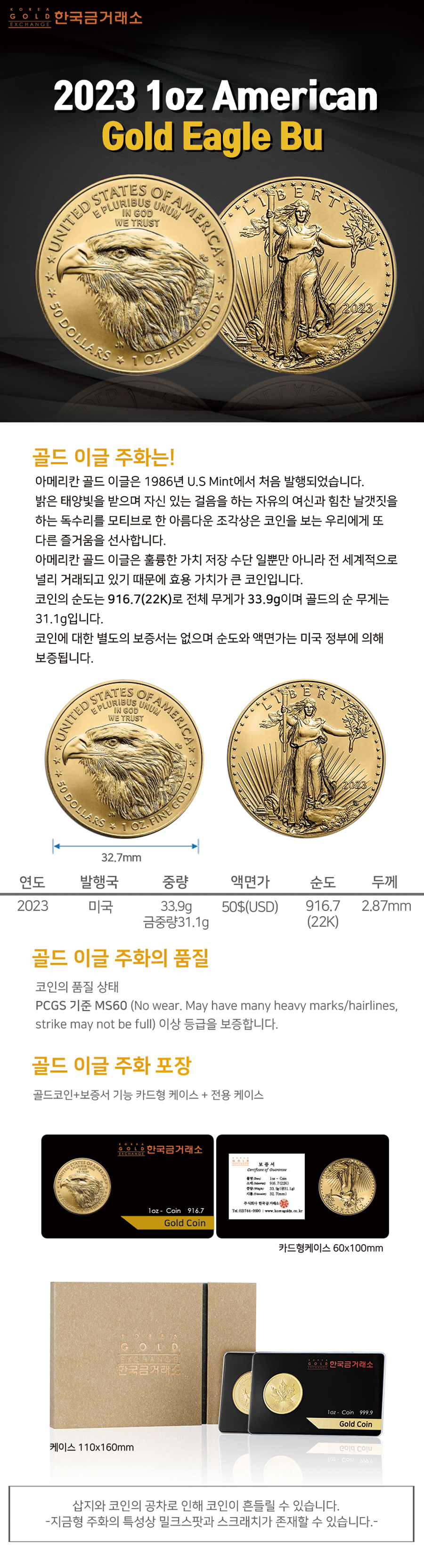 2023 1온스 아메리칸 골드 이글 불리온 주화(Coin) 50$(USD) - 22k